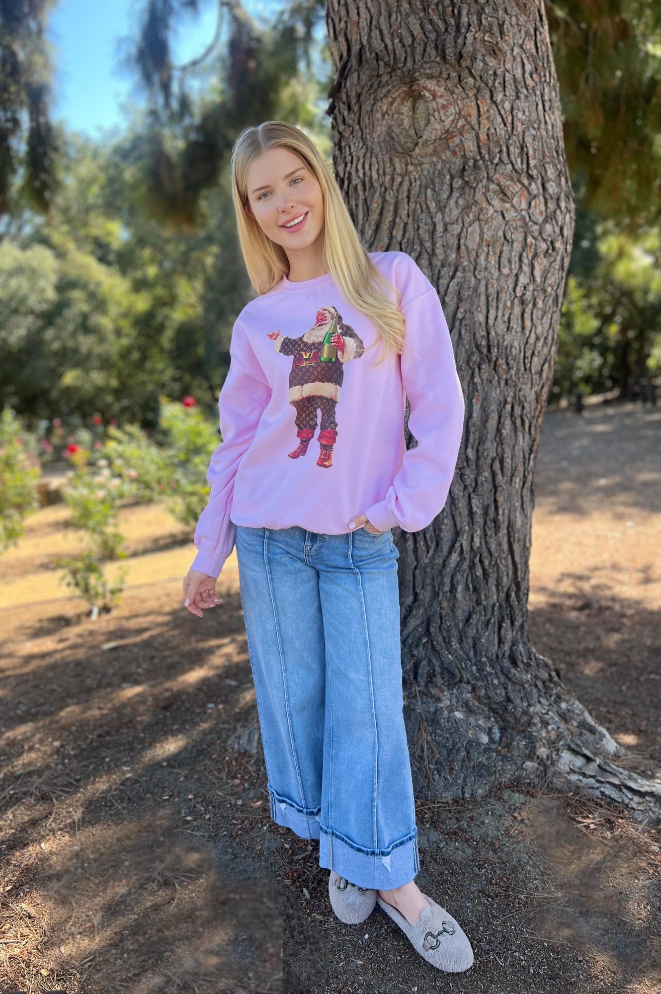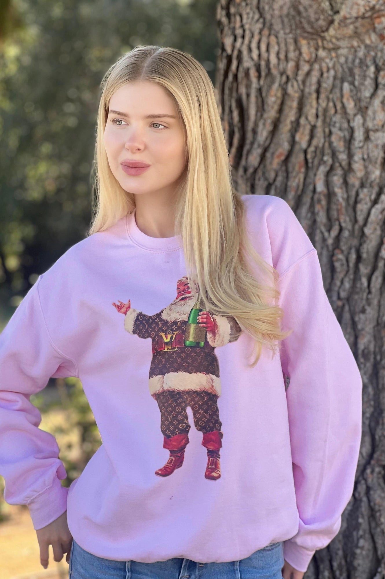 We are obsessed with this adorable soft sweatshirt in light pink with a Bougee Santa and Champagne.