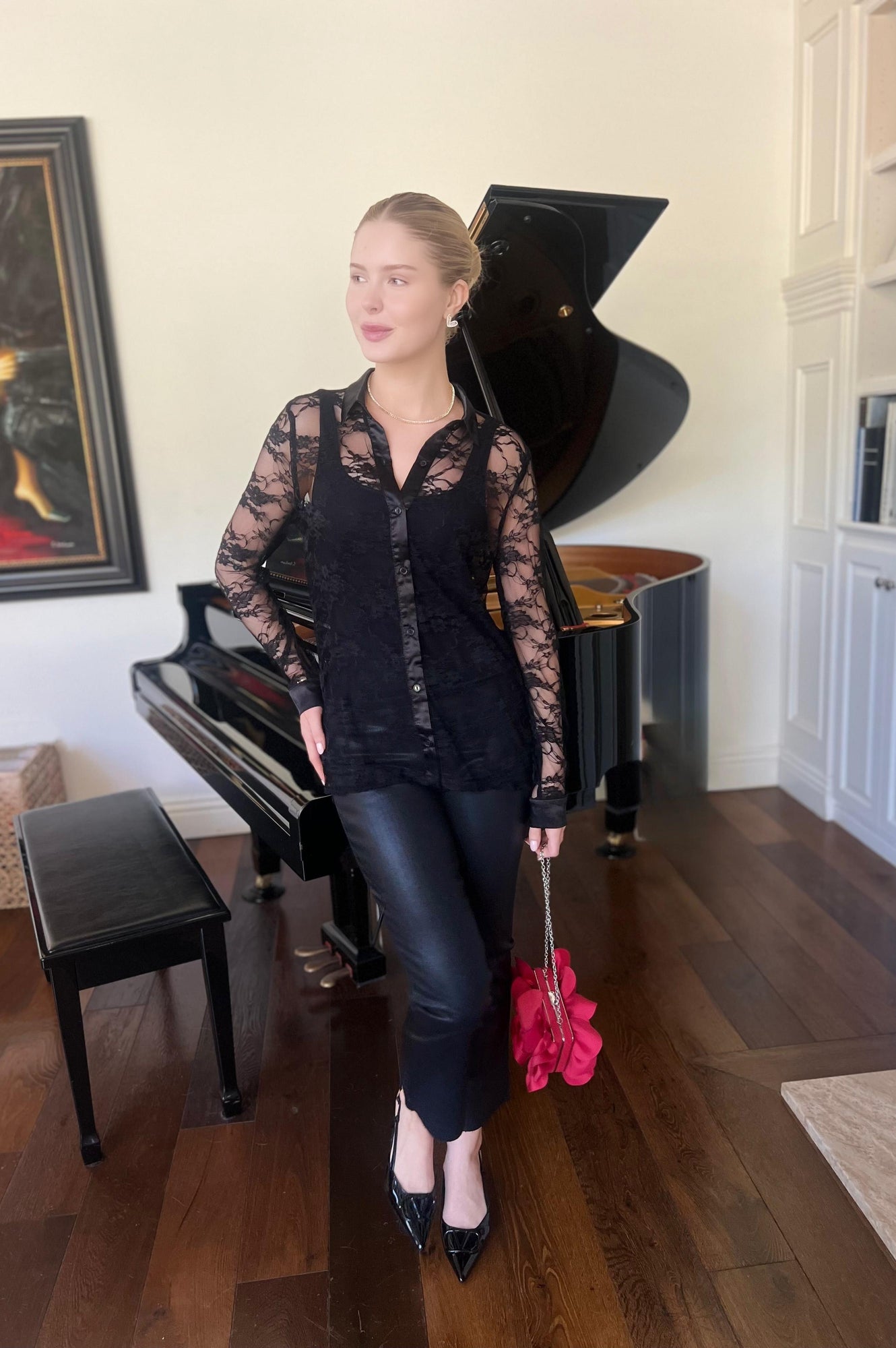 Make a statement with this sheer lace button down top, a perfect blend of elegance and modern edge. Designed with delicate floral lace throughout, it features a classic collared neckline, button-front closure, and long sleeves with satin-trim cuffs for a touch of sophistication. The relaxed silhouette makes it versatile enough to wear layered over a bralette, cami, or bodysuit.
