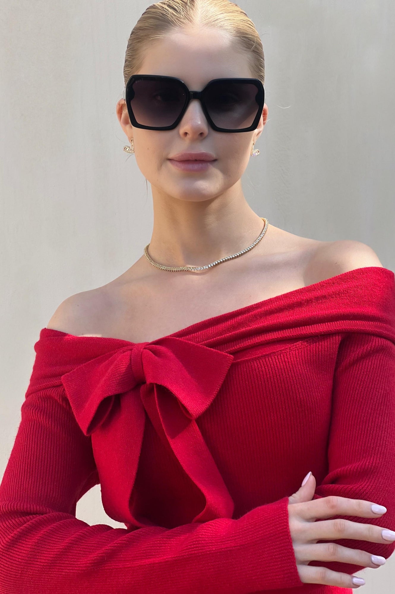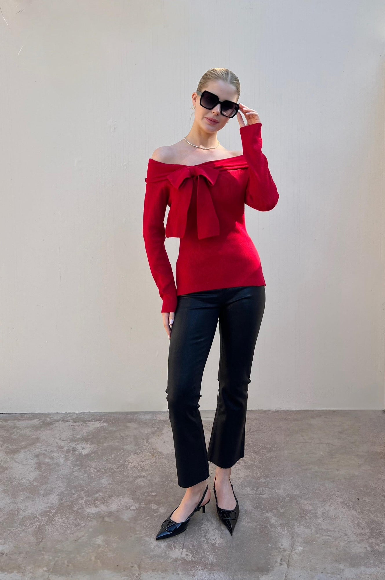 This charming off-shoulder sweater combines cozy comfort with standout style. Designed with a wide, fold-over neckline that elegantly drapes across the shoulders, it features a beautifully structured oversized bow at the front for a feminine and playful touch. The soft knit fabric provides a snug yet breathable fit, while long sleeves with subtle volume at the cuffs add to its graceful silhouette. Ideal for both casual days and dressier occasions, this sweater pairs effortlessly with jeans, skirts, or tailored bottoms to create a chic look.