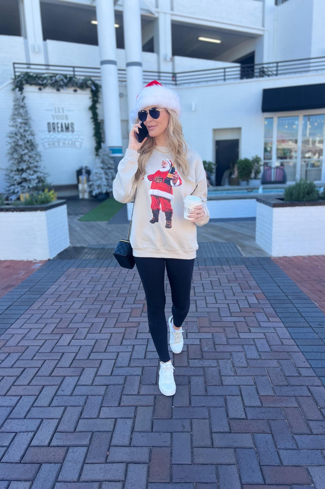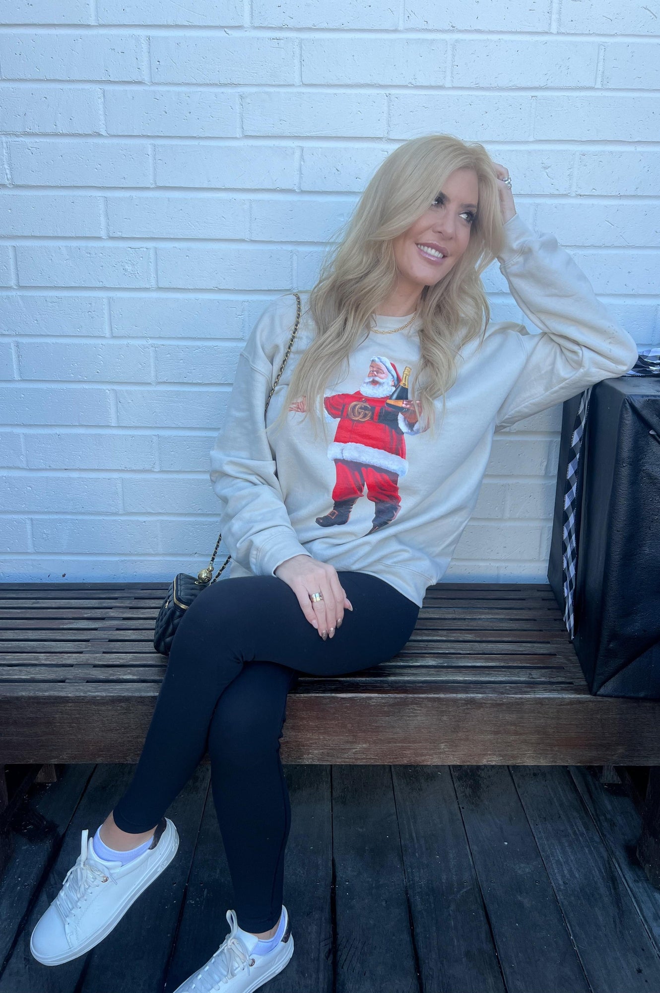 We are obsessed with this adorable soft sweatshirt with a Bougee Santa and Champagne.