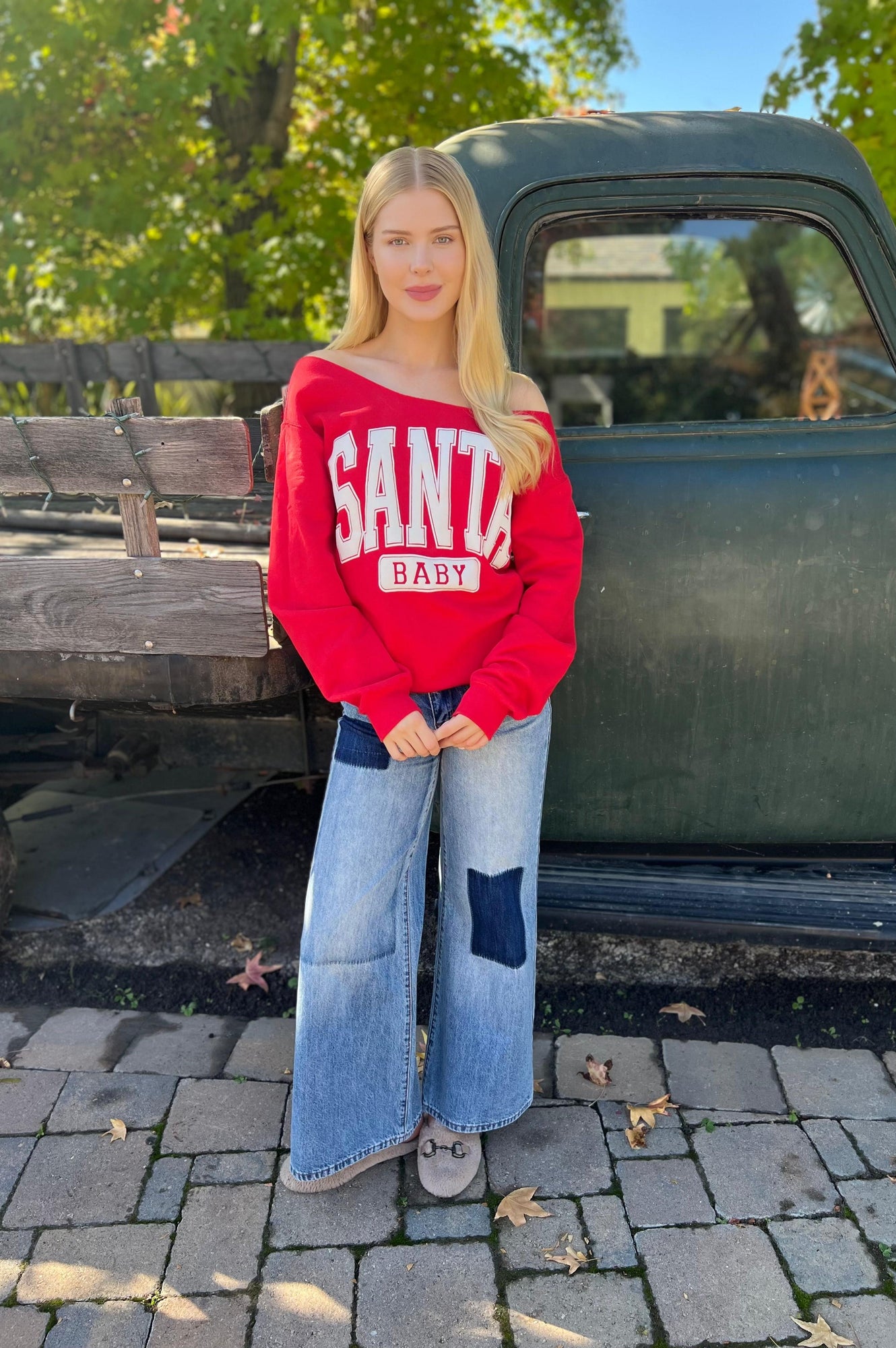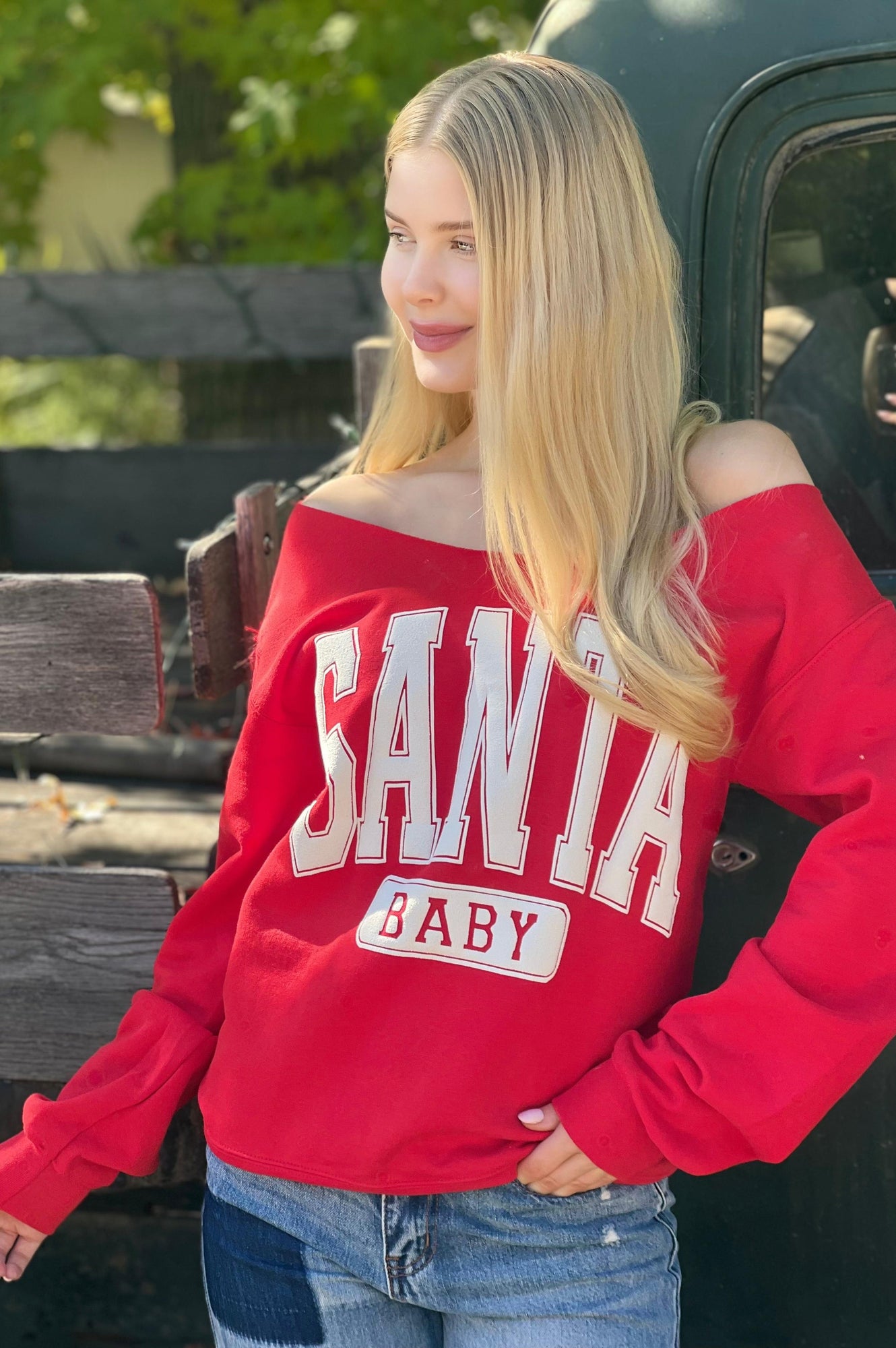 Santa Baby Graphic Crewneck Off the Shoulder. Absolutely adorable. Soft and cozy for this Holiday Season.