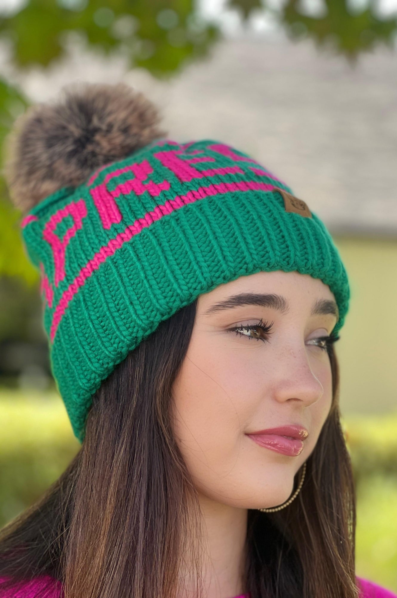 Adorable knit beanie with faux fur pompom and Apres detail.